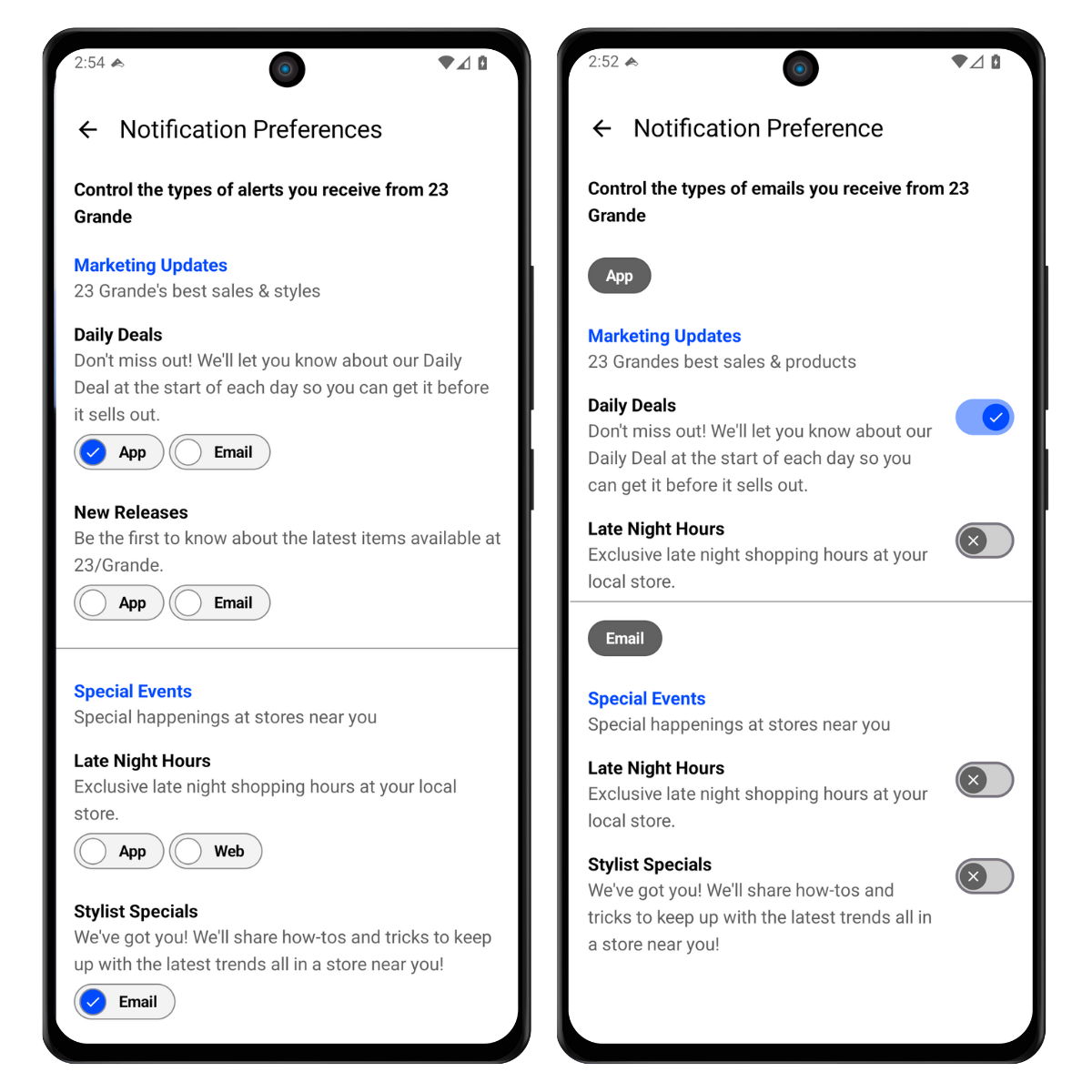 Display a Preference Center with a single method call. The Preference Center will be launched in its own Activity over your app, allowing users to manage their subscription preferences, and automatically syncing changes with Airship.