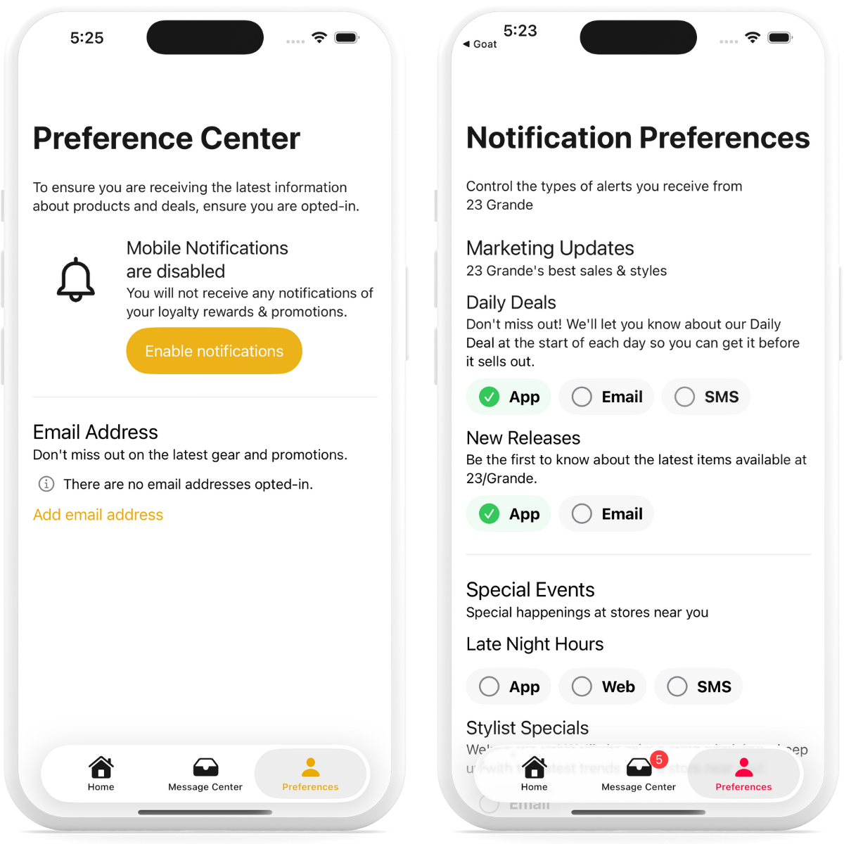 Display Preference Centers using the Airship UI, which automatically handles user preferences and syncs with the Airship backend.