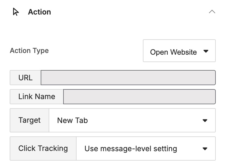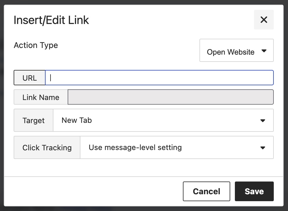 When using the WYSIWYG editor for email, Rich PagesA landing page or Message Center message in your app that can include HTML, video, etc., and In-App AutomationMessages cached on users’ devices and displayed when users meet certain conditions within your app, such as viewing a particular screen or opening the app a certain number of times., you can assign an action that occurs when a user taps a button, link, or image in the message. You can also use HandlebarsHandlebars is Airship’s templating language for personalization. Handlebars expressions use double curly braces wrapped around a content template, ranging from a simple variable, e.g., {{first_name}}, to complex evaluations of personalization data. to personalize the actions.