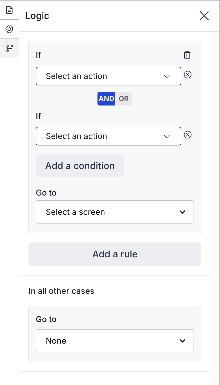 | Set the branching logic for a screen | The Logic panel will open for editing. | Select a screen card, and then follow the steps in Set branching logic. |