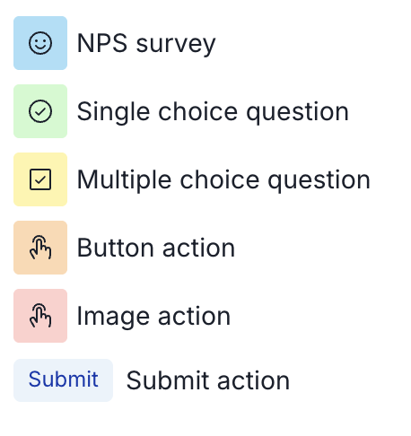Action Steps Button action None. Is tapped is set by default. Image action None. Is tapped is set by default. Single choice question Select is or is not, and then select an answer. Multiple choice question Select answer includes or answer does not include, and then select one or more answers. NPS survey Select is equal to, is not equal to, is lower than, is greater than, is lower or equal to, is greater or equal to, and then select a value. For Go to, select which screen should appear if the user performs the actions as configured in step 2.