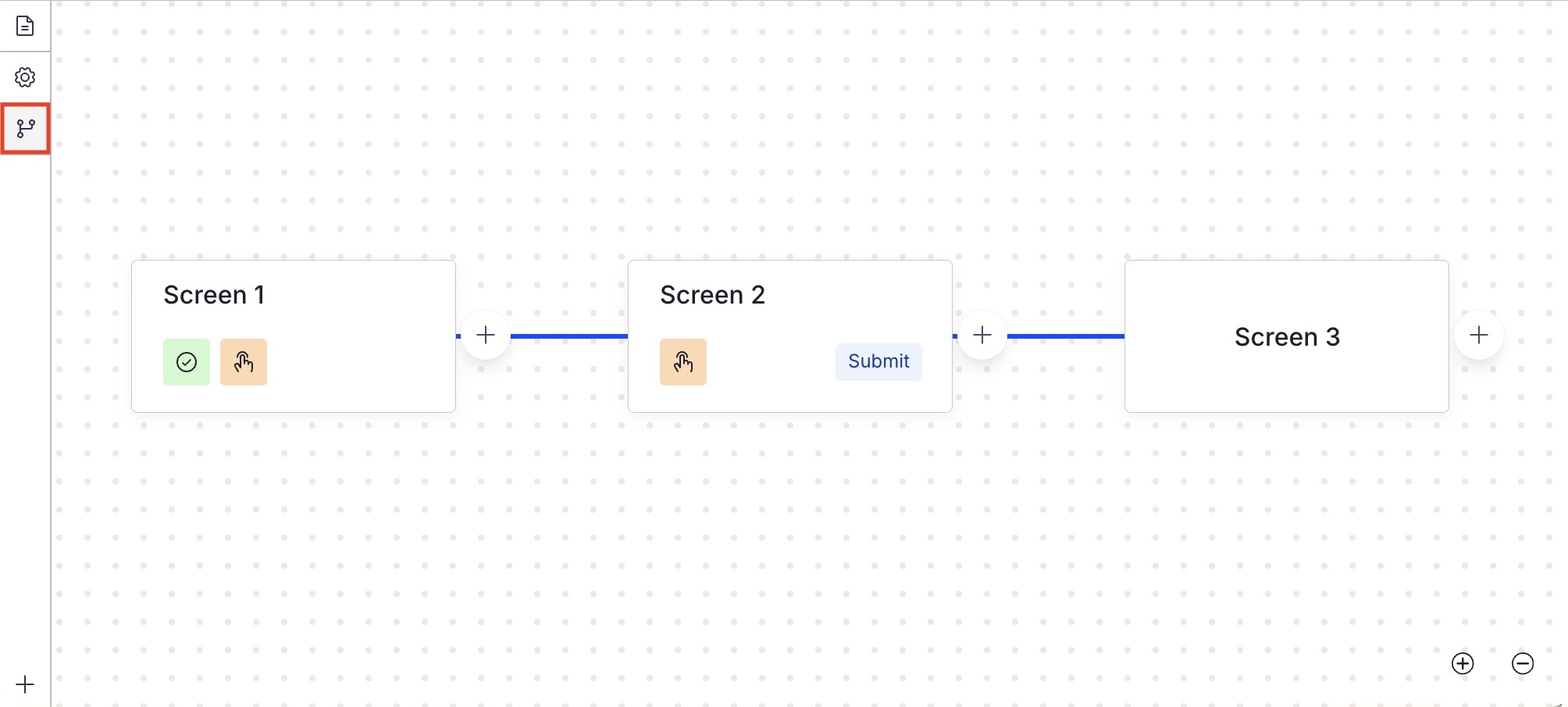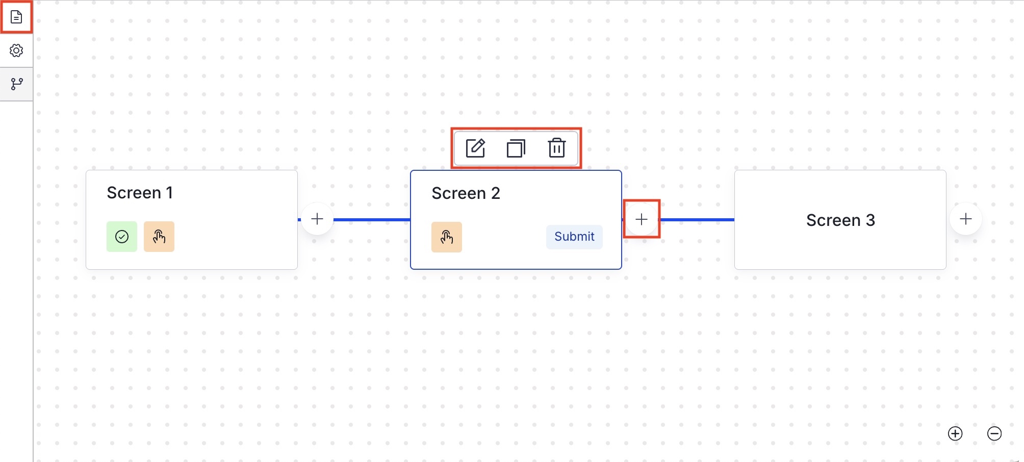 | Add a new screen as a branch | The new screen will be added as branch from the selected screen. The branching logic rule will be set to go to the new screen without a condition. | Select the plus icon () to the right of a screen card. |