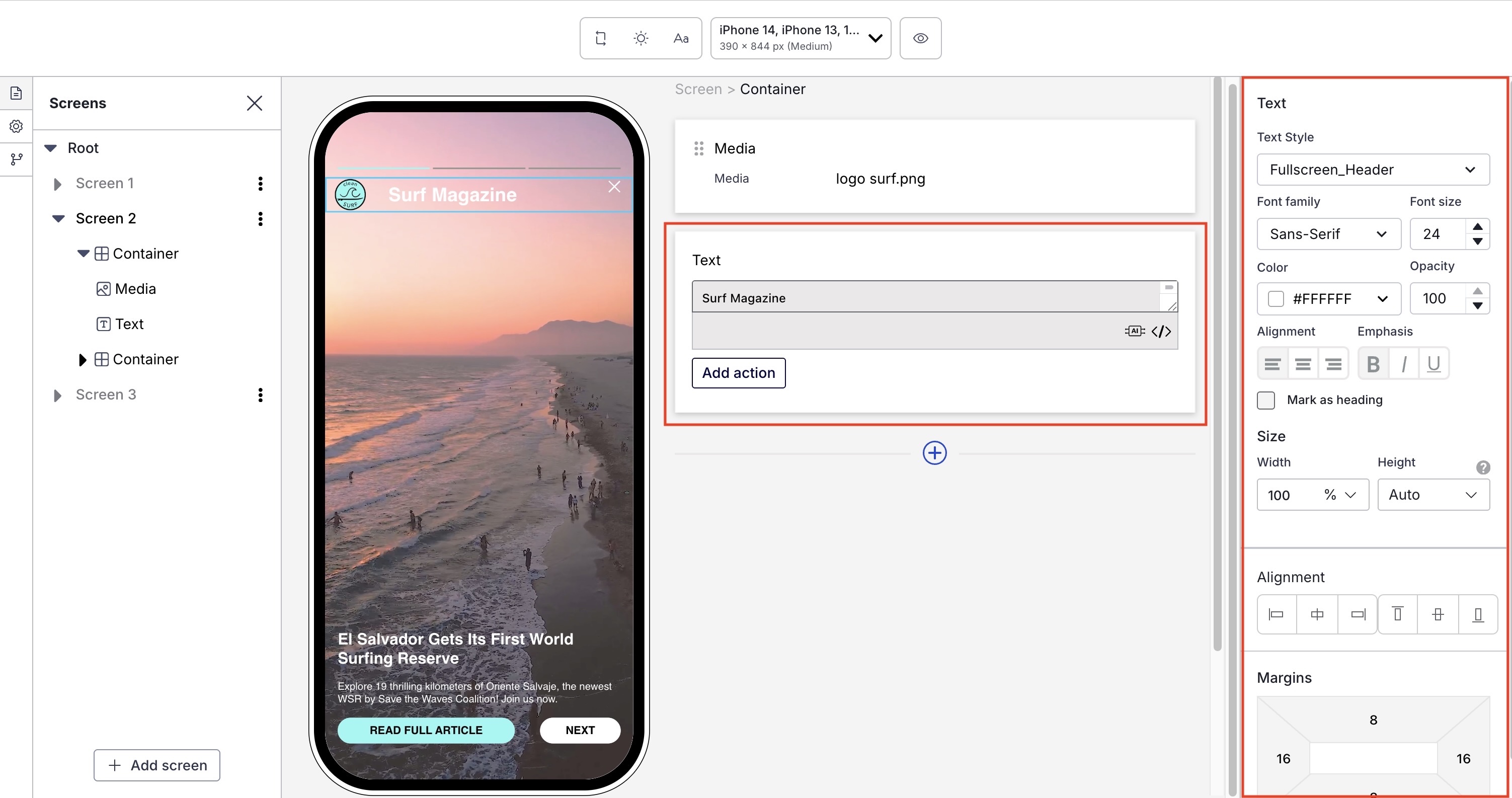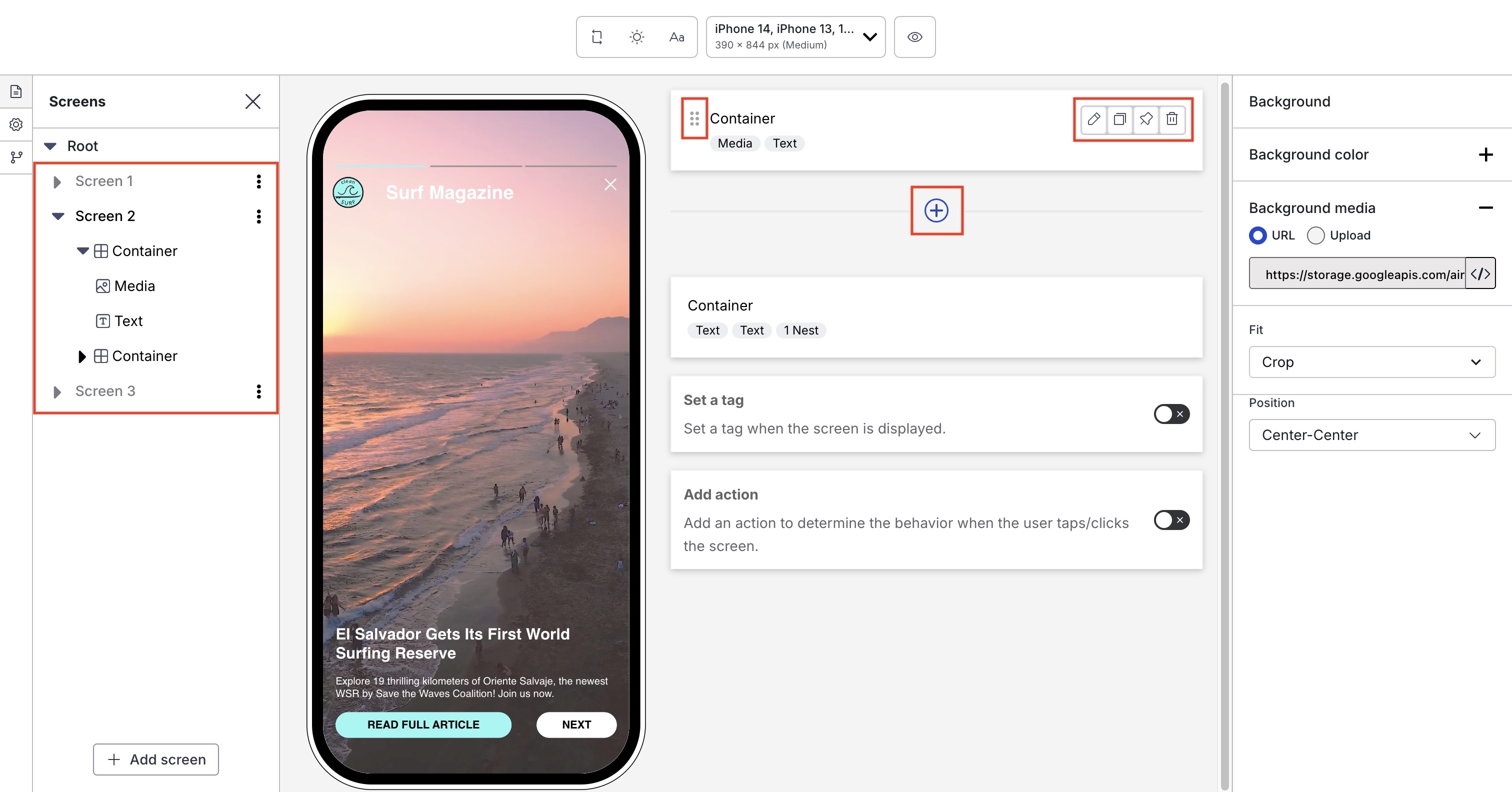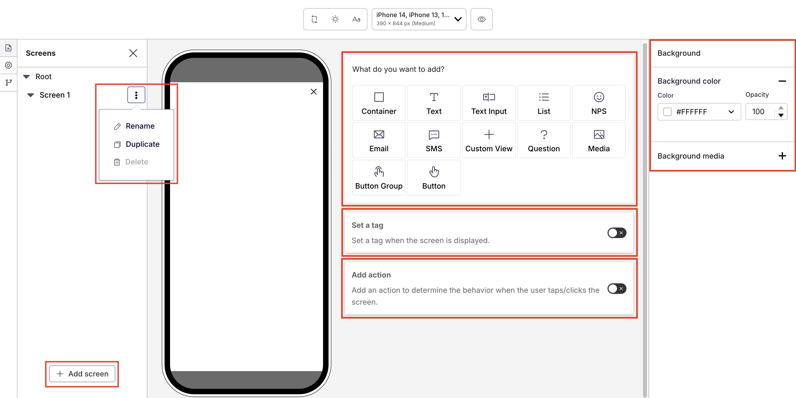 - Add content elements, the visual components of the screen, or use AI to generate screen content.