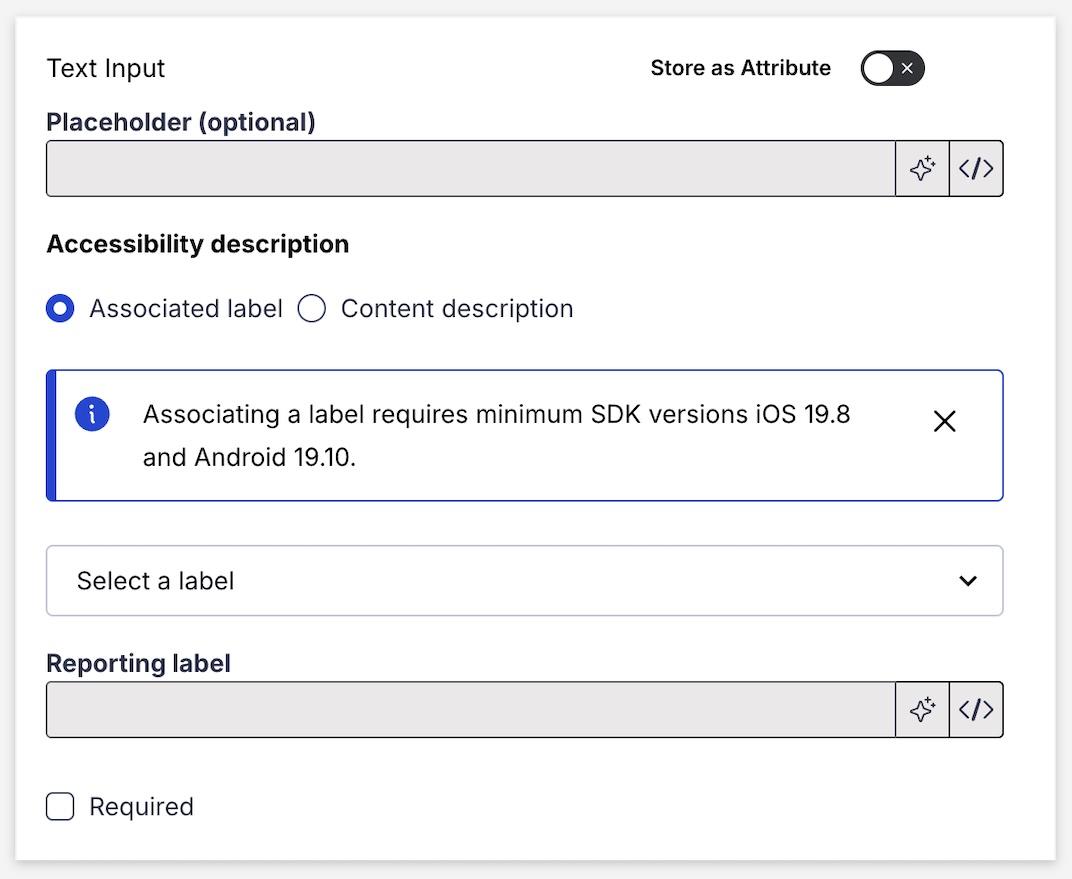 Store as Attribute | Optional. Enables storing input as text an AttributeMetadata used for audience segmentation and personalization. They extend the concept of Tags by adding comparison operators and values to determine whether or not to target a user, helping you better evaluate your audience.. To use this feature, you must first add the Attribute to your project. | Toggle to enable, then search for and select an Attribute. |