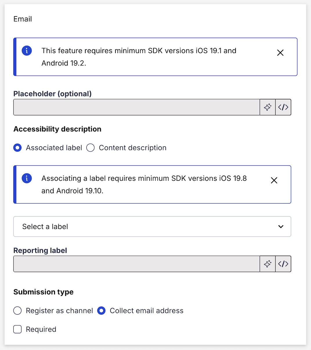 Submission type | Required. Determines whether the phone number will be only collected as data or also registered as a channel. | Select a type. For channel registration, select at least one Sender IDAn originating phone number or string identifier used to indicate who an SMS message comes from. Members of your audience subscribe (opt in) to each sender ID they want to receive messages from. to associate with the channels, one ID per country. For collection, select which countries can submit phone numbers. |